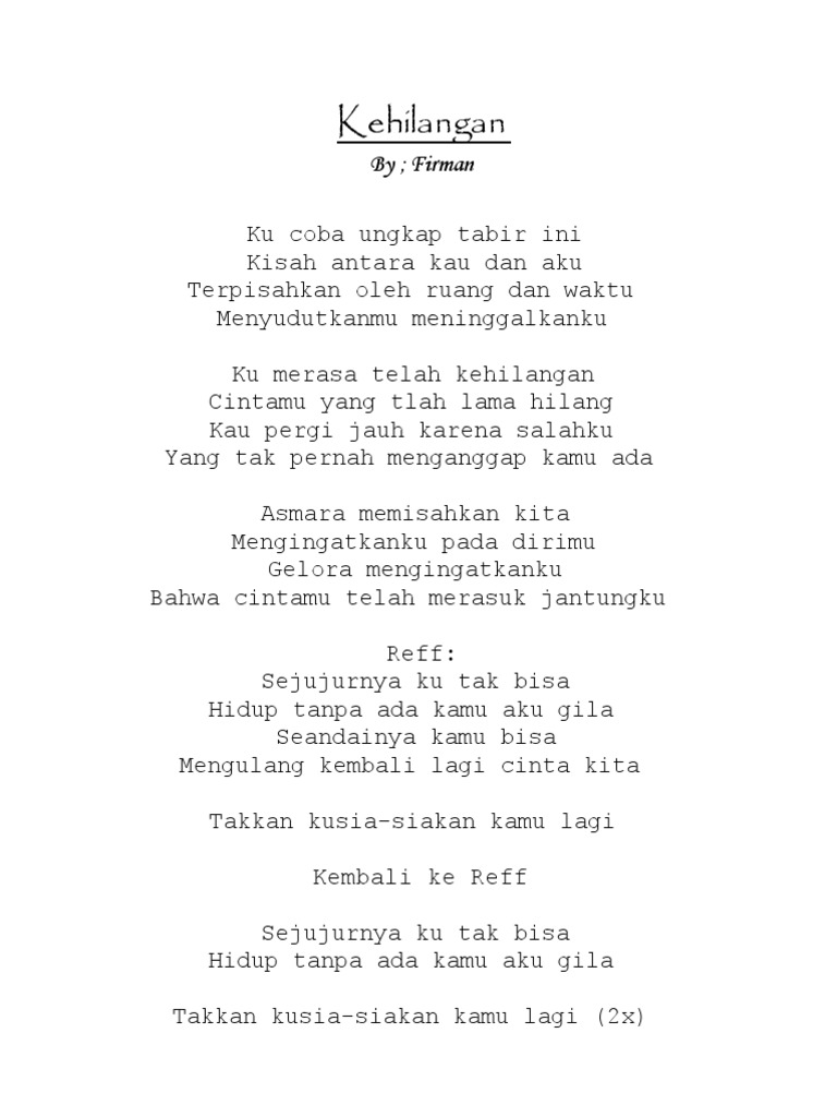 Selamat Datang Di Fanspage LIRIK LAGU. Am Em katamu cintaku berlebihan Dm Am cemburuku tak beralasan Dm Am bagaikan burung dalam sangkar F E maafkan aku sayang. CHORUS Gm Cm Aku takut kehilangan dirimu F B D Aku takut takut kehilanganmu Gm Cm Aku takut kehilangan cintamu F B Aku takut hidup tanpa dirimu Cm Aku tak akan bisa Gm Aku yang bisa gila E D Bila kau.